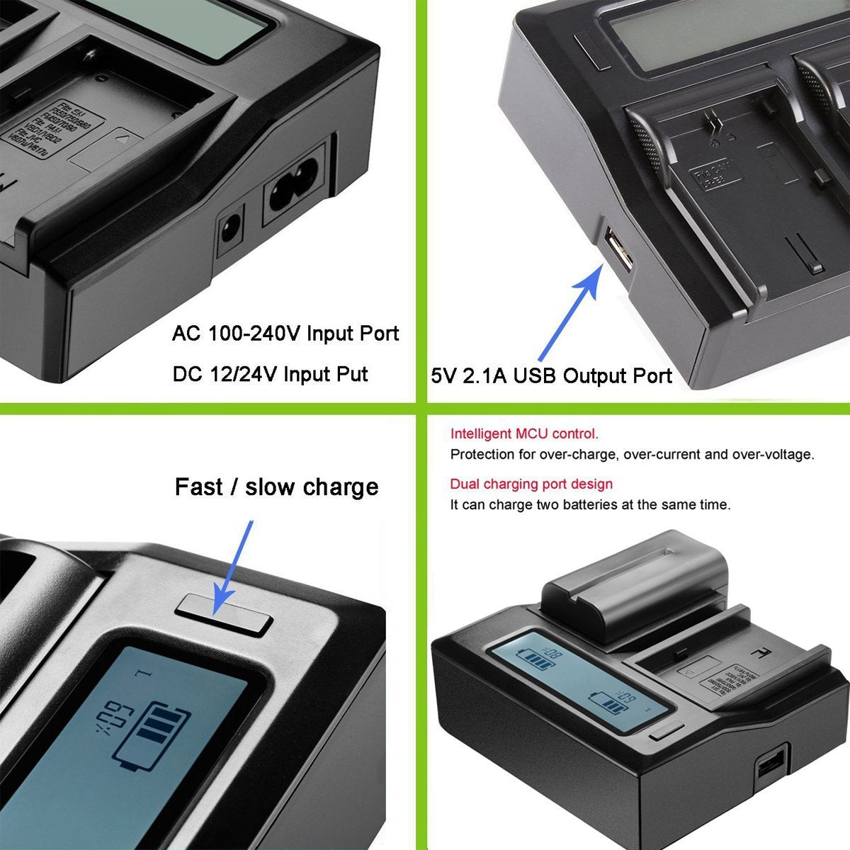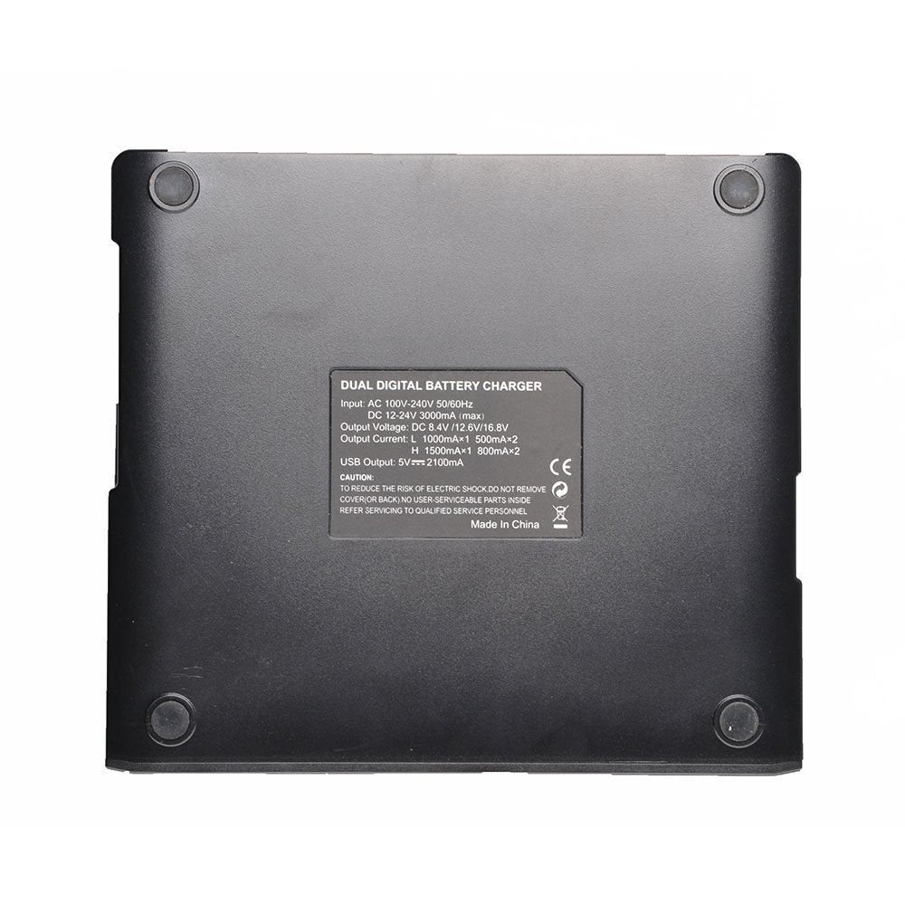 Intelligent Dual Charger charges two lithium-ion batteries at the same time. Recognizes when charging, the charging voltage required, so no battery damage occurs. LCD display tells it the current charge status Dual charging modes (Faster Mode for quick charge and Low Speed Mode for normal charge) As a little extra at the side of the Chargers a USB port for additional charging of mobile devices (5V, 2100mAh).